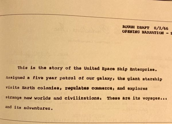 X personality Subcommander Tal shares earlier drafts of the narration by Bob Justman, John D.F. Black, and Gene Roddenberry. They reflect different visions of what the story, originally conceived of as a "wagon train to the stars" would become.
