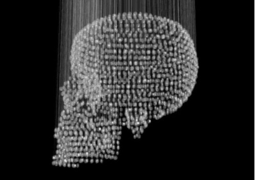 Artist/Designer Kelly Lamb's hanging light fixture is creepily elegant. It appears to be made of tiny lightbulbs hung from the ceiling on filaments and arranged in the shape of a human skull although there are no details provided at the artist's site. This skeletal lighting would fit well with a goth interior.