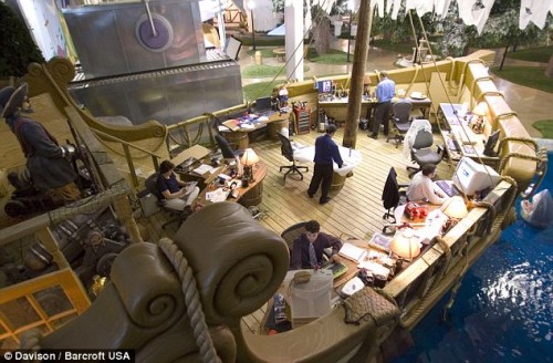 We have all heard of dream office environments like at Google where workers get free lunch, laundry and massages. But one company has taken things to the next level by decorating their work space to look like something more appropriate at a theme park. I like how despite the office looking like a Disneyland ride, if you notice the men in the photos are wearing dress shirts and ties. They like things casual, but respectable.