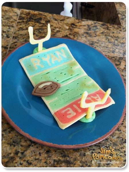 We've previously featured the works of Jim Belosic of Jim's Pancakes, including his dinosaur pancakes, Tetris pancakes, and pancakes in the shape of a crane. Recently he made these dandy football pancakes. Does this remind anyone else of childhood games of paper football?
