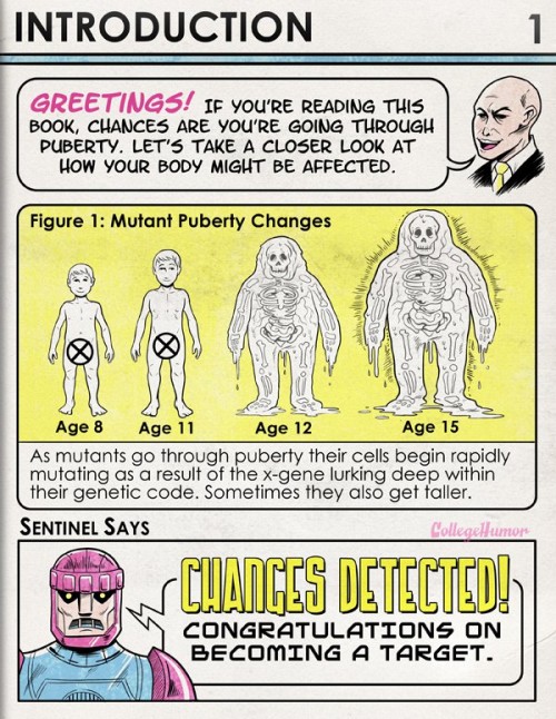 All mutants go through that awkward stage when their mutations begin to affect their bodies. But it's okay! Don't feel bad about it and don't feel like you can't ask questions about what you're experiencing. Professor Xavier is here to help you with this handy guide. Click on the link to read the rest.