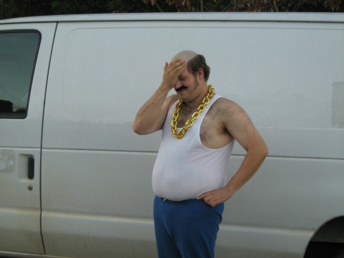 On the TV show Aqua Teen Hunger Force, Carl Brutananadilewski is the main characters' next-door neighbor. redditor magasjaru made this nearly-perfect costume of him for Halloween last year. A true fan, he even shaved his head. And, I see, added fake body hair. That was a nice touch.