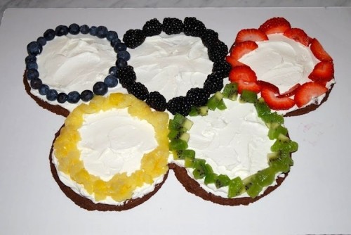 The London Olympics officially begin tomorrow with the Opening Ceremonies, but they'll continue for a couple of weeks. That's plenty of time to plan a Olympics-watching party. The Olympic Rings Fruit Pizza shown is just one of many ways to serve edible Olympic rings. You'll find them and other colorful party tips in a roundup at Buzzfeed. Link