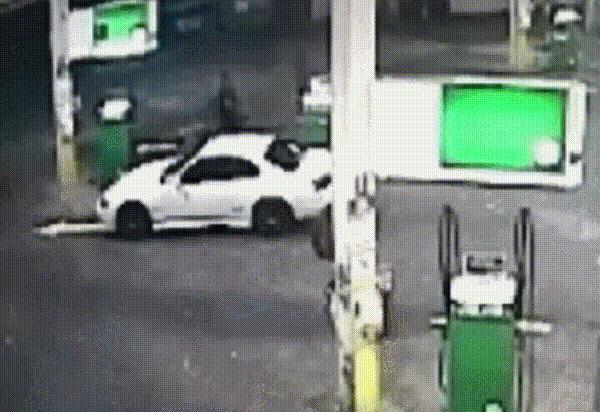The owner pumped gas and went inside to pay for it. The thief then got inside the car and tried to drive away. The owner jump kicked through the open car window into the car. After some fighting, he was able to get fully inside.