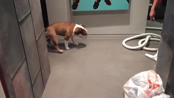 His doggie dance is good for more than one situation, as well. When his human busts out the house vaccuum, it's proper pup protocol to back up and give it a wide berth. Via Laughing Squid