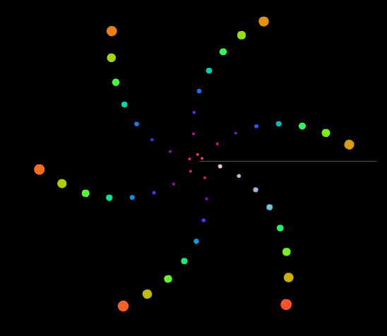 The Whitney Music Box is a musical realization of the motion graphics of John Whitney as described in his book "Digital Harmony". The dots are arranged to trigger notes on a chromatic scale when they pass the line. The dots are each timed to a different speed, but they synchronize themselves at constant intervals. Its a bit hard to describe, but you'll love seeing it in action. There are 17 music box variations. |