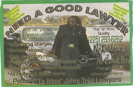 Maybe it's just me, but I think the whole stuffy lawyer image is ok. Stereotypical attorneys may not be people I'd want to hang out with outside of the court room, but they sure know their way around loopholes. That being said, I just don't want an attourney that looks like he just fell out of a Little John video with his sweet Mercedes and Jamacian belt buckle. Oh well, I guess if you need help getting something expunged from your record, he's your man.