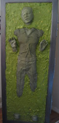 If only Luke Chipwalker could stop by and help unfreeze him by gulping down all of that delicious lime-loaded guacamole. (He added extra lime juice to make it thick enough to stand like that.) It took him about a day and a half to get the creation together:The body was created using a plastic torso I found at a used mannequin/store display shop downtown. It only went down to the top of the thigh, so I had to build out the rest of his legs to the knees using molded chicken wire. The hands were tough... If I knew used male mannequin hands would be so tough to find on a whim, I would’ve used eBay. Given that I was running out of time, one hand was made using one of those articulated wooden artist’s hands you can buy at an art store, and covered it in papier mache. The other hand, not nearly as nice, was foil covered in papier mache, and had to do for now. The boots were old work boot toes I cut and epoxied to the board. [...]