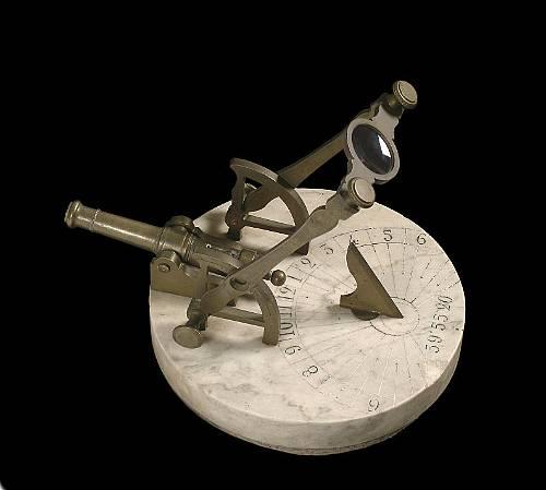 Mounted on a 9" marble base is a small brass cannon, and above that a magnifying glass. The positioning and focal length of the lens would be designed to light the cannon's fuse. The placement of the sundial suggests that the device was used to mark the arrival of the noon hour (on sunny days).