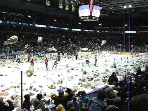 Teddy bear tosses are promotional events, typically at hockey games. The stuffed animals are collected and donated to hospitals and other charities. The very cheerful video above shows "the London Knights teddy bear toss on December 4th, 2009 against the Guelph Storm. The bear count was 8232."