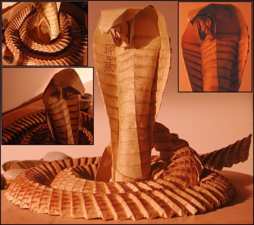 deviantART user orscobrusco specializes in origami. He's put pictures of impressive pieces in his gallery, such as this cobra. It was made from a single sheet of paper with no cuts or glue. Here's his description run through Google Translator: