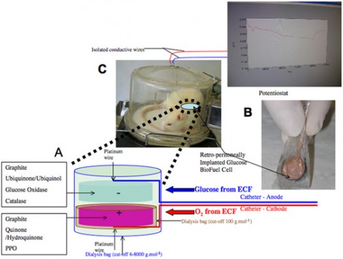 The trick the scientists worked out was to build the cell's electrodes out of compressed graphite, which has been treated with enzymes that oxidize incoming glucose molecules, with a resulting release of electrical energy. Add in a plastic-based membrane that only permits glucose and oxygen to penetrate and some platinum wiring and what you get is the world's first successful glucose fuel cell that can harvest chemicals already present in a living organism. It's capable of putting out a peak power of 6.5 microwatts in its experimental implementation, which is not enough to power a typical pacemaker (which needs around 10 microwatts) but the team is confident that the tech can be optimized to achieve this power output.