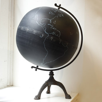 The surface of this world globe is like a blackboard. It comes with the outlines of the continents painted on it, but you can fill in the national boundaries and country names with chalk, so the globe will never be out of date (like mine, which has East Germany, the USSR, and Yugoslavia on it). Only $450! Link -via Nag on the Lake