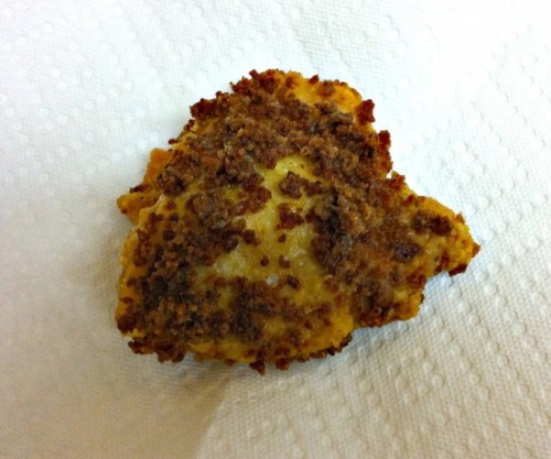 So our friend over at GeekDad, Matt Blum, is on a mission which, in his words, means "trying anything and everything with bacon or bacon flavoring that I can lay my hands on. I will be trying the questionable bacon products as a public service, so you don’t have to." To-date, he's made and/or reviewed , Bacon Gumballs, a hamburger wrapped in ten strips of bacon, a hamburger ground entirely from bacon, and most recently: Fried chicken with a bacon crust.