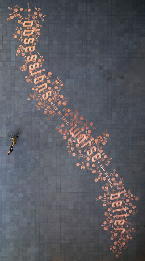The coin mural spelled out the sentence "Obsessions Make My Life Worse and My Work Better."