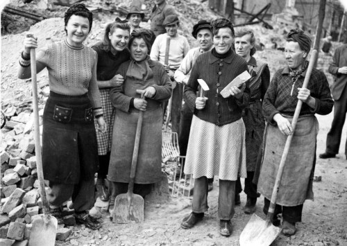 Der Spiegel has an image gallery of "Trummerfrauen," or "rubble women" who were charged by the occupying Allies with cleaning up the wreckage of German cities bombed during World War II. There weren't enough German men left to do the job, and the women had to use their bare hands and whatever equipment they could round up on their own. The job still took years. Recovered materials were sorted to be reused. Link -via TYWKIWDBI