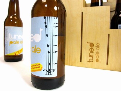Tuned Pale Ale is a product by designer Matt Braun. There's a musical scale down the side of each bottle. You can drink down to a particular level, blow on rim, and the bottle will play a note. If you get a few people together with these bottles, you'll be able to perform a melody. Braun writes: