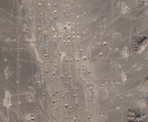 introspective, every single one of those circles was a nucluar bomb detonated underground. almost all nuclear tests done in NV since the 80s has been underground. that is a very large satallite image. most of our testing was done to ensure they will work 100% of the time in a real world action. what was also tested were different warhead structures and reliability models. and most of the explosions wernt even full bombs, but only fractions.