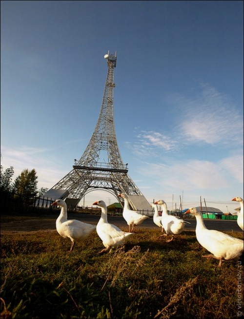 In 1815, Cossacks returning from the Napoleonic Wars established a village in what is now the Chelyabinsk oblast of Russia. They named it Paris, and their descendants later erected a miniature Eiffel Tower. At the link, you can view several pictures of the site.