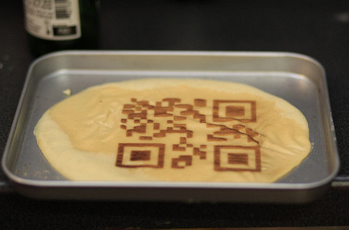 QR Code Pancake The hacker group NYC Resistor hosted a competition of QR coded foods. Pictured above is one entry, a laser-etched pancake. At the link, you can view a Flickr set of the contest submissions.Link via Make | Photo: Trammell Hudson Comments (3) Newest 3 Newest 3 Comments OK, so with a little Photoshoppery, it actually scanned using QuickMark on my Nexus One:http://www.flickr.com/photos/50494019@N00/5198751896/ Abusive comment hidden. (Show it anyway.) Now why isn't the picture taken straight on? None of my scanners can read the pancake at this angle! Abusive comment hidden. (Show it anyway.) That appears to be a par cooked pancake or a crepe. Abusive comment hidden. (Show it anyway.) Login to comment. Click here to view up to the first 100 of this post's 3 comments