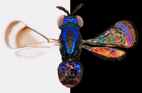 The researchers studied wings under microscopes, against black backgrounds. But once Janzen, who breeds wasps for his research on caterpillar-parasite symbioses, started to look, colors could be seen by the naked eye as wings passed over insects’ black bodies.