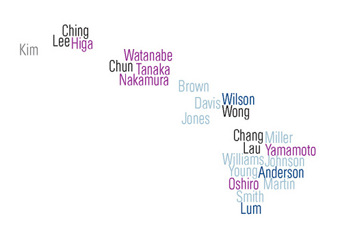National Geographic has a large interactive map of surnames in the United States. The most common surname for a given area is listed in each location. The relative size represents the commonality of the name, and the color represents the geographic origin of the name. Pictured above is a screenshot of Hawaii as it is depicted on the map. Where's the most common name where you live?