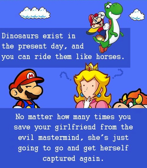 And I'd say I turned out alright. What's more, it turns out I'm not the only one who was mentored by Mario. Case in point: Julia Leptit's Dorkly piece "Everything I Need to Know in Life I Learned From Super Mario," which is not only brilliant but is also not the craziest thing a kid could learn. Or an adult, for that matter.