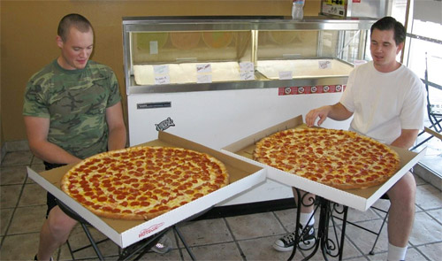 If you have a big appetite and a big stomach, you might use this list of food challenges as a vacation guide. But beware: these offers have rules, like you have to eat everything on your plate in a certain time period to get the meal free. Eateries may have additional rules. LW Pizza in Long Beach, California, dares you to eat the 28-inch pizza shown in less than an hour with no bathroom breaks! If you do, the pizza is free plus you win cash and future pizzas. Link -via The Daily What