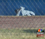 They’re using plywood cut outs of coyotes, which is the natural enemy of geese. In the cutouts they placed plastic bags to make them look like they were carring a goose in their mouths.