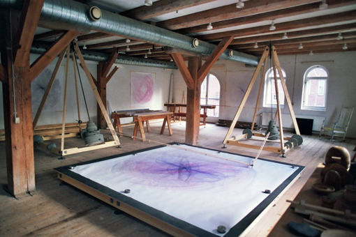 Remember playing with a Spirograph when you were younger? Imagine playing with one that takes up your entire living room. Swedish designer Eske Rex made this cool contraption that creates art decidedly larger than the pieces we used to make as kids. Rex says he's never heard of the nostalgic toy and instead based his invention on a 19th-century tool called a harmonograph.