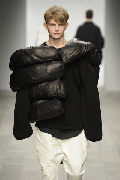 Korean fashion designer Kathleen Kye made a jacket that looks like the wearer is wrapped up in King Kong's hand. This piece, inspired by a dream that she had of being squeezed by a giant hand, was one of several that Kye made for her graduate portfolio entitled "The Body Collection."