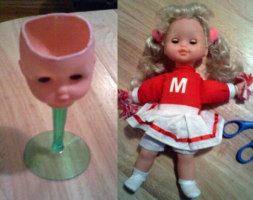 Because you've always wanted to know, right? It's a fairly straightforward process. Cut off the doll's head and then saw off the top of her skull. Next, cut the stem of the plastic wine glass (or a glass one, if you're daring) at the level so that the top will fit over the hole in the doll's neck. Shove them together, pour wine, and serve.