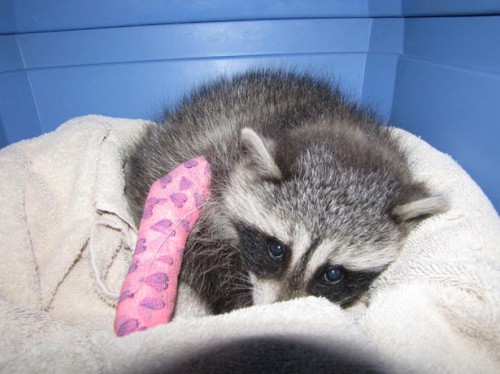 Samantha, named by a volunteer, now sports a bright pink splint. After quarantine, she will be socialized with other young raccoons rescued from the same area before being returned to a green space in the fall within 15 kilometres of the Bloor St. W. and Lansdowne Ave. area where she was attacked, as is required by law. Residents in the neighbourhood said Samantha’s mother kept returning to the backyard looking for her missing baby in the days following, but has since given up her search.