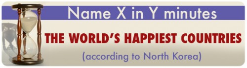 North Korea released the results of their "happiness survey" a few weeks ago (we had the item, but looking at it now would be *wink* cheating). According to the survey, South Korea and the United States are the UNhappiest places in the world. Meanwhile, Today's Lunchtime Quiz at mental_floss asks you to name the top five happiest countries in the survey in one minute. Can you do it? Link
