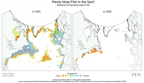 This image shows the biomass of popularly-eaten fish in the North Atlantic Ocean in 1900 and in 2000. Popularly eaten fish include: bluefin tuna, cod, haddock, hake, halibut, herring, mackerel, pollock, salmon, sea trout, striped bass, sturgeon, turbot. Many of which are now vulnerable or endangered.