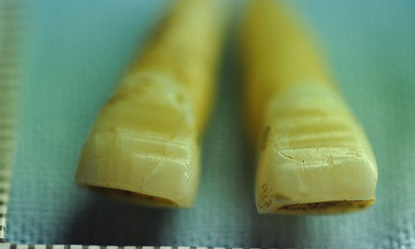A road crew in Dorset, England found a mass grave of Viking bodies that appear to have been slaughtered by Britons, as their heads, torsos and legs were buried in separate graves and no weapons, equipment or clothing were found. The bones showed signs of utter brutality being delivered upon the poor fellows, but more intriguing is the fact that the Vikings teeth had horizontal lines deliberately filed into them. Archaeologists feel that this was done in order to appear more fearsome in battle, and that the excruciating filing of the teeth must have been done by a master craftsman.