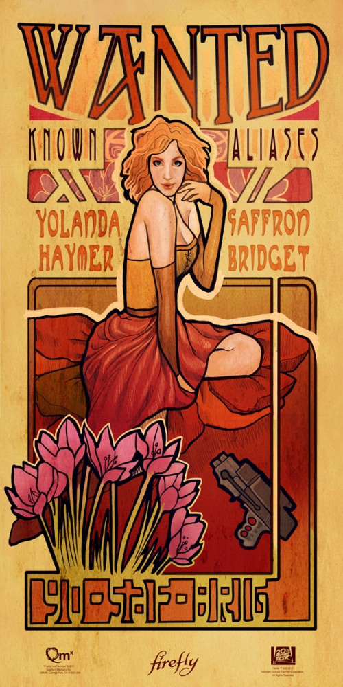 If you love Firefly and you love art, then you're bound to love these great Firefly art nouveau posters made by designer Megan Lara. The set of 4 posters, which features Kaylee, Zoe, Inara and River, is going for $29.95. The Saffron poster is sold separately.