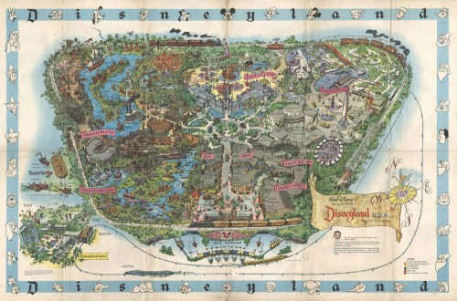 Have you ever wondered what Disneyland had to offer before it began getting massive, modernizing facelifts? Then take a look at this old map of the magical kingdom from 1962, scanned and uploaded in full size by Wishbook, with lots of classic Disney character heads surrounding a detailed, Imagineer drawn map! Look for the view all sizes button on Flickr and choose original size if you want to read the tiny text, and see all the pretty little drawings up close.