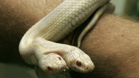 Not that one is to believe that two heads are better than one... especially when it comes to snakes! Zookeepers in the Ukraine's Skazka Zoo have experienced a doubling of visitors since this two-headed albino snake arrived on loan from Germany. Each head is able to act and think on its own. Zookeeper Rusian Yakovenko stated that sometimes the two heads will fight for food, not realizing that it has the same destination. They'll even steal food from each other, making feedings interesting, to say the least. Workers state that the three-year-old two foot long snake is quite a handful. The private zoo is in the resort of Yalta on the Black Sea.