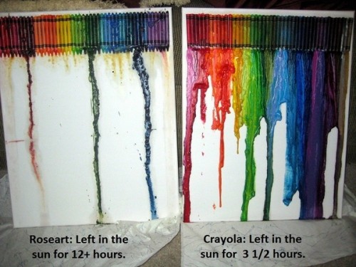 Reddit user Katiedidit was making some art by melting crayons on a canvas in the hot Texas sun. She had a couple of brands on hand and decided to try each on a canvas. Surprisingly, the Roseart barely melted, making you wonder... What's in those things if not paraffin?