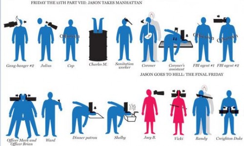 Jason Voorhees was a busy boy during the Friday the 13th movies, so it can be easy to get confused about who died in which manner. Thankfully, Andrew Barr and Mike Faille of the National Post put together an infographic summarizing each murder in each movie. Pictured above is a small selection from it. Link | National Post