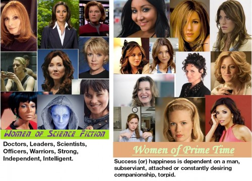 I think these examples were cherry-picked, but I do believe there is something to the point. In aggregate, you will undoubtedly find more strong-minded females in sci-fi than in prime time. ESPECIALLY if (as the graphic does) you include reality tv. Seriously...Snooki? So there are examples in prime time that WE could cherry-pick, but on the whole, the graphic has a point.