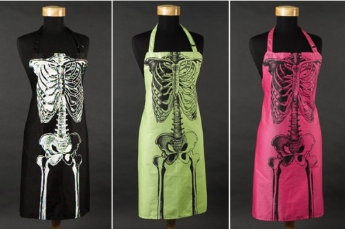 The very popular Skeleton Apron is back in stock at the NeatoShop. This apron is only available for a limited time. Get your Skeleton Apron before it is too late.This fantastic chef apron is made of 100% cotton canvas and is available in black, green, and pink.