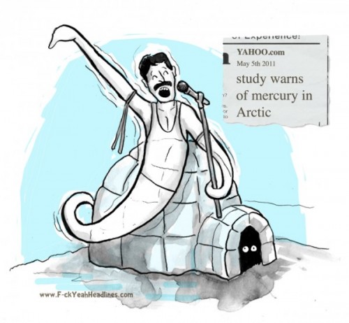 So maybe "mercury in the Arctic" doesn't make you think of the ghost of Queen frontman Freddie Mercury hovering around an igloo. But someone over at F*ck Yeah Headlines has a weird sense of humor, and turns normal-seeming article titles into these silly cartoons. There are lots more (this is my favorite) over on Tumbler. Link | via Flavorwire