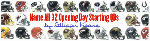 The National Football League begins its new season on Thursday. Today's Lunchtime Quiz at mental_floss will determine how psyched up you are! Football fans: can you name the starting quarterbacks for all 32 NFL teams playing this weekend? Some of them may surprise you. You have five minutes -and mental_floss even gives you a starting hint. Good luck! Link