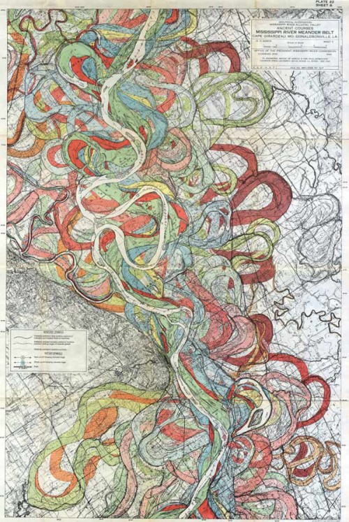 The Mississippi River seems eternal, but it changes over time. How much? You can see in a collection of colorful maps at Visual News. Cartographer Harold N. Fisk produced them in 1944, with different colors to show the past and current flow of the mighty Mississippi. Link -via the Presurfer