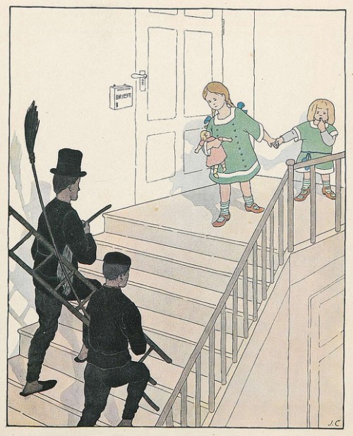 In English, that's Who's Coming? which was a kinderbuch (children's book) from 1910 showing all kinds of people who come to the house. The illustrations are by Julie Conz, and you can see eleven of them at BibliOdyssey. Not only are they beautiful, but they also highlight how differently goods and services were provided 100 years ago. Link