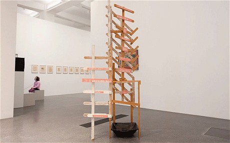Entitled “When It Starts Dripping From The Ceilings” the piece comprised a tower of wooden slats with a plastic bowl at the bottom painted brown to give the impression of discolouration caused by water. The cleaner took the paint to be an actual stain and scrubbed the bowl till it looked new.