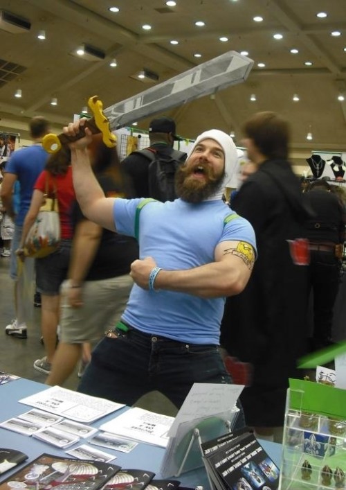 Who would have guessed that Finn, from the Cartoon Network series Adventure Time, would grow up to be such a badass? Since his arms and legs are like noodles on the show, I'm thinking he went through a gym rat phase as he grew up. Now he looks like he can kick some serious tail!