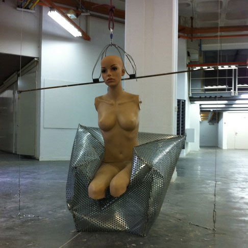 Dropping a cement filled mannequin on a perforated metal trapezoid is a really strange way of creating a chair, and it looks as you would expect it would-crumpled and uncomfortable. But hey, you can't blame designer Ezri Tarazi for trying to come up with something new in the world of furniture design. If only he could find a more practical use for a cement-filled mannequin, say as a wrecking ball or to weigh down a snitch when he drops them in the ocean.